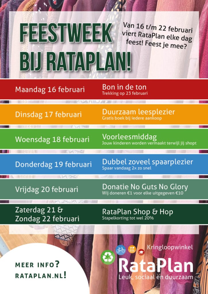 Van 16 t/m 22 februari viert RataPlan weer feest! Tijdens de feestweek bieden wij onze klanten duurzame acties, gezellige evenementen en hele mooie kortingen! De feestweek wordt in al onze vestigingen gevierd en wij zien jou graag terug voor een hoop gezelligheid! Wij denken dat deze week een perfecte kans is om te laten zien hoe kringloopwinkels bijdragen aan duurzaamheid en hergebruik!
